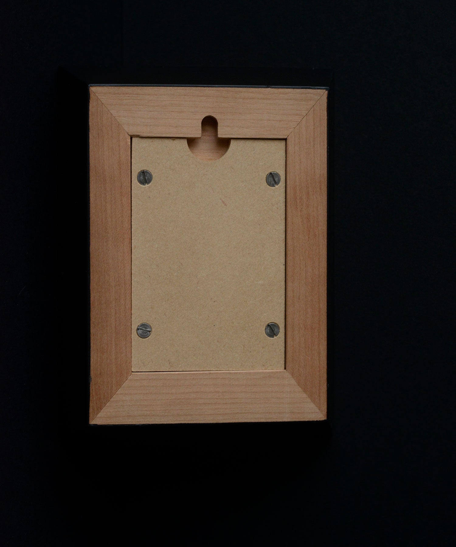 覗き込んでいるうちに多くの想像をもたらしてくれるフレームです。ブラックチェリー材の表⾯を平滑にしないようやや凹凸のあるテクスチャーに仕上げること、下地に5層の特殊加⼯を施し厚みのある表⾯と持たしたことで唯⼀無⼆な表情があります。壁にぴったりと沿うように美しく仕上げられた背⾯も印象的な逸品です。
