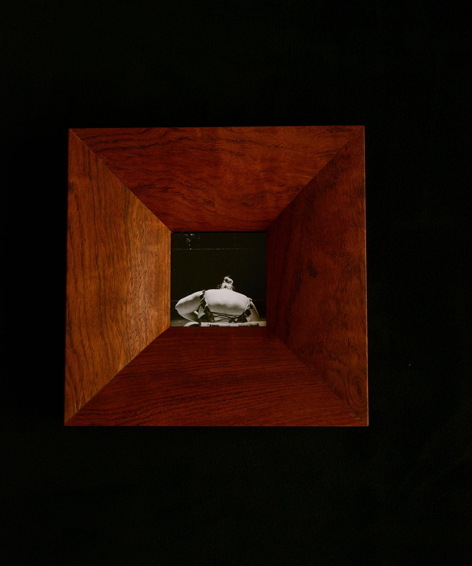 覗き込むような形状と松原博⼦⽒の⼥性の体の写真の相性がユーモアのある⼀点です。壁に沿うように丁寧に仕上げられた背⾯が美しいですが、置いて飾ることもお勧めしています。